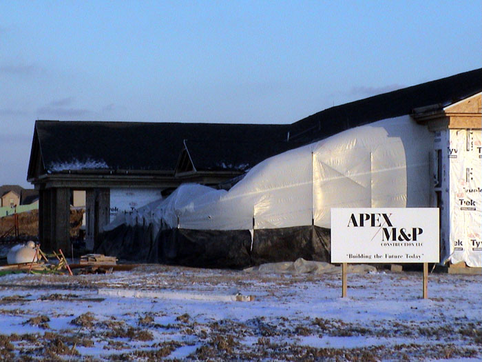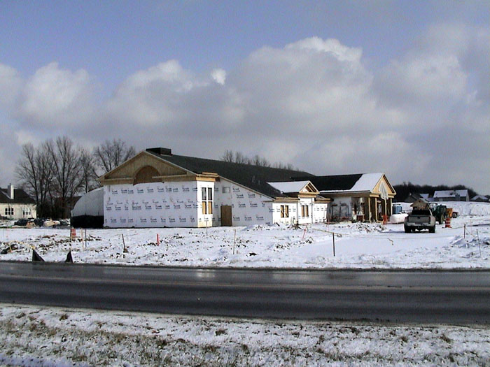 Thursday, January 9, 2003The south slope of the roof is almost done.There is now plastic up around the south entry. So the bricklayers will be working on that next. |