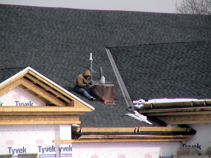 Friday, January 31, 2003It was another fine day for being on the roof. The roofers weren't there, but the HVAC guys were installing some vents. |